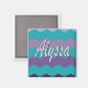 Este ímã com padrão de cóvron é personalizado com o nome Alyssa. O diafrão é composto por listras azuis brilhantes texturizadas alternando com listras púrpuras texturizadas que gradam de roxo escuro a lilás claro. É perfeito para sua Alyssa favorita colocar na geladeira ou no armário da escola.