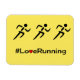 Um simples slogan em texto preto com um coração vermelho, e um pictograma de três corredores acima. Amarelo de fundo. Perfeito para mostrar seu prazer em esporte e exercício. #LoveRunning.