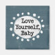 O texto em negrito lendo "Ame-se, Bebê" está centrado em um fundo de cinza. O texto preto se senta em um círculo branco com grandes pontos brancos texturizados ao seu redor, fornecendo um contraste divertido contra o pano de fundo colorido.