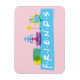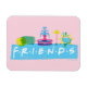 Este gráfico colorido apresenta o logotipo FRIENDS™ junto com ícones clássicos da série de TV.
