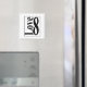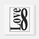 Um ímã preto e branco simples que tem "Love 8" ou preferencialmente "Love Infinity" em uma caixa.