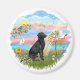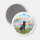 Pela faísca da água azul e no fundo de um céu iluminado por sol multicolor, um feliz homem negro Labrador Retriever se senta pacificamente como um anjo da guarda aparece nas nuvens e uma pomba paira à luz de uma estrela do dia.