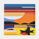 A.I. criou a interpretação de uma composição cubista e geométrica que representa a silhueta de um anjo vestindo um chapéu grande sentado num pequeno barco com a haste de pesca ancorada sobre um lago calmo refletindo o pôr do sol distante.