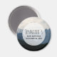 Íman de aniversário ou chá de fraldas com uma fotografia de belas montanhas, céu nublado e colinas rolantes cheias de árvores em primeiro plano. esquema de cor azul da cinza.