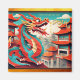 Estilo originami para um Dragão colorido e fofo em uma velha cidade asiática (ilustração) + Feliz Ano Novo Chinês + desejos de ouro em Chinês + ouro 2024. Design no ímã quadrado. Cartão de boas-vindas, cartão postal de feriado, adesivo quadrado e muito mais em breve. Perfeito para o Ano Novo Chinês do Dragão 2024.