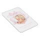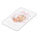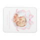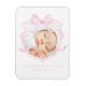 Este ímã de anúncio de nascimento apresenta um design suave e elegante. Ele exibe uma foto de um bebê recém-nascido moldado por uma delicada fita cor-de-água rosa na forma de um arco. Com um esquema de cor rosa e branca, faz uma escolha perfeita para anunciar a chegada da sua menina.
