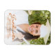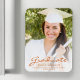 Íman de anúncio de graduação moderno com uma foto vertical personalizada com sobreposição de texto. A palavra "Formando" aparece na escrita laranja queimada, com o nome do formando, a escola e o ano de graduação abaixo na fonte sans serif. Substitua facilmente a imagem de amostra pela foto do seu próprio formando. Uma tela de gradiente branco ajuda a garantir os pop de texto. Ideal para segundo grau ou formandos.