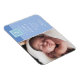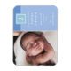 Ímã de anúncio de nascimento de bebê menino com foto e monograma moderno para apresentar seu lindo recém-nascido. Com uma foto do bebê, inicial do monograma e estatísticas de nascimento em branco e mensagens em dois painéis azuis suaves.