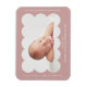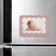 Ímã de anúncio de nascimento moderno com a foto do seu bebê aninhada dentro de uma moldura com recorte em rosa po dusty. Personalize o ímã de anúncio de nascimento em rosa po dusty adicionando o nome do seu bebê e informações adicionais em letras brancas.
