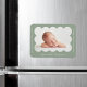 Ímã de anúncio de nascimento moderno com a foto do seu bebê aninhada dentro de uma moldura recortada verde-sage. Personalize o ímã de anúncio de nascimento verde-sage adicionando o nome do seu bebê e informações adicionais em letras brancas.