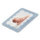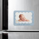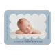 Ímã de anúncio de nascimento moderno com a foto do seu bebê aninhada dentro de uma moldura ondulada azul clara. Personalize o ímã de anúncio de nascimento azul claro adicionando o nome do seu bebê e informações adicionais em letras navy.