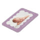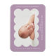 Ímã de anúncio de nascimento moderno com a foto do seu bebê aninhada dentro de uma moldura recortada roxa clara. Personalize o ímã de anúncio de nascimento roxo adicionando o nome do seu bebê e informações adicionais em letras brancas.
