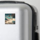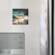 Água turquesa e palmeiras num ímã branco de arte praiana. Citação: "Apaixonado pelo mar."