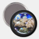 Aquário de água salgada com coral, rochas, areia branca e vários peixes coloridos de água salgada. Em cores de branco, azul, turquesa, roxo e preto. Divertido pela geladeira.