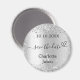 Uma Imã salve a data para o seu casamento. Um fundo com aparência de prata falsa, texto preto. Decorado com confete e um pequeno coração. Personalize e adicione seus nomes e data de casamento.