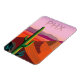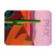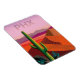 Este design é um poster contemporâneo com uma simples expressão gráfica de paisagem desértica em vermelho quente, rosa e roxo com cactus saguaro em primeiro plano. Abreviação de texto "PHX" aparece na parte superior da poster e "Arizona" em pequeno tipo branco na parte inferior.
