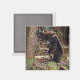 Um filhote de urso preto se inclina contra uma árvore em pé sobre um toco coberto de musgo, procurando por uma flor. Do meu acrílico na pintura de conselho.