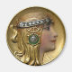 Um ímã redondo com uma imagem dourada de Art Nouveau de uma jovem que veste uma morada de diamante. Veja a coleção inteira de Gemstones & Medallions Magnet na seção HOME.