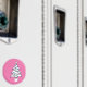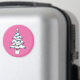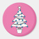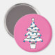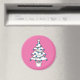 Uma ilustração de uma elegante árvore de Natal branca e chique com muitas bolas azuis penduradas em fundo rosa. Esta design é para pessoas que amam o Natal, dando presentes e presentes.