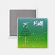 Um fundo verde bonito com flocos de neve brancos a cair. Uma árvore baleeira e uma mensagem de paz.