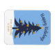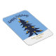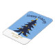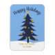 Um desenho animado azul escura e esverdeado, com uma estrela dourada e ornamentos circulares de bola brilhantes simulados. A árvore é cercada por um céu azul brilhante e flocos de neve brancos caindo. A árvore está em um banco de neve branco. Feriados felizes em fontes azuis e uma segunda linha em fontes amarelas/castanhas ouros escuras podem ser personalizados com sua própria mensagem.