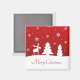 Simples ilustração de Natal moderna e minimalista, com silhuetas brancas de renas, árvores, bonecos de neve e flocos de neve, com Feliz Natal a saudar de fundo vermelho.