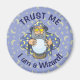 Um velho feiticeiro com capa azul olhando para a bola mágica de cristal.