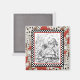 Um ímã quadrado com uma Alice branca e preta no País das Maravilhas da imagem de Alice sob ataque dos Cartões em um quadro preto e branco de pranchas de xadrez em um fundo de cartas de jogar em vermelho. Veja toda a coleção de Wonderland Magnet nos TOUCHES ESPECIAIS | Seção Favoritos para festas.