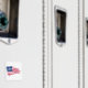 Imagem estilizada da bandeira americana com o símbolo ateu atômico no campo azul onde estariam as estrelas.