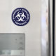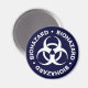 Íman azul escuro com um símbolo de risco biológico branco e texto de aviso.
