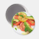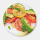 Tomates fatiados vermelhos e amarelos com abacate, folhas frescas de oregano com vinagre de azeite e framboesa numa placa branca quadrada com azeitonas verdes e negras em taças pequenas