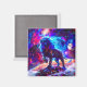 Um leão majestoso com um homem azul brilhante, que se ergue orgulhosamente contra um pano de fundo da galáxia, potência radiante e elegância cósmica.