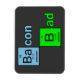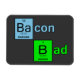 A frase "Bacon Bad" Uma colher de uma mostra de cabo popular, as letras "Ba" da palavra "bacon" e a letra "B" da palavra "bad" foram substituídas por símbolos da Mesa Periódica dos Elementos.