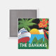 A ilustração colorida das Bahamas com navio de cruzeiro, papagaio, palmeira, flores de hibisco e o nome Bahamas em letra deco vintage. Memórias rudimentares!