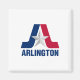 Magnet com a bandeira de Arlington, Texas. Uma bandeira branca com uma letra A azul e vermelha e uma estrela prateada no centro
