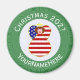 Íman redondo para decoração de Natal com um anjo vestido na bandeira dos Estados Unidos da América. O anjo é encontrado dentro de um círculo branco de quadrados pretos com um fundo de quadrados verdes pretos. Adicione seu próprio texto, se desejar. Personalize com um nome e personalize com o ano. Coisa divertida. Honre sua herança americana durante o feriado.