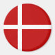 A bandeira vermelha e branca da Dinamarca, ou Dannebrog, tem uma Cruz Nórdica ou Escandinava. O vermelho é o fundo, a cruz está em branco. A bandeira dinamarquesa aparece aqui num ímã redondo.