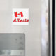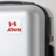 Grandes letras vermelhas explicam o nome da província de Alberta, com uma bandeira canadense ondulada voando atrás dela. Esse design está disponível em uma grande variedade de t-shirts, presentes e outras roupa.