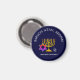Na moda, elegante HANUKKAH BLESSINGS Magnet. Design mostra um MENORAH dourado com uma ESTRELA multicolorido DE DAVID e cinza prateada DREIDEL. No topo há um texto curvo que diz BARUCH ATAH, ADONAI (Abençoado seja você, Ó Deus) e abaixo do texto lê-se HANUKKAH BLESSINGS. TODO O TEXTO É PERSONALIZÁVEL, para que você possa personalizar com sua própria escolha de saudação e texto. A cor de fundo é azul da meia-noite. Outras versões estão disponíveis na Coleção HANUKKAH por Designs Berean.