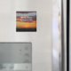 This beach wedding guest favor magnet features a photo of the sun setting over the Pacific Ocean. The sunset lights up the sky and underside of the clouds in bright orange with a stripe of gray blue still visible between the clouds. The foreground captures the dunes in shadow as the sun sinks lower on the horizon. The bride and groom's names and the wedding date appear in white font among the clouds.
