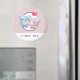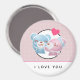 Magnet que diz: Eu Te Amo. Projetada com uma bela imagem de desenho animado de um casal de urso, o urso é rosa pastel com um pequeno arco e está beijando a bochecha de um urso azul que parece positivamente encantado. Um pequeno coração rosa está flutuando sobre suas cabeças. Muito fofo e kawaii. O padrão de fundo é uma cor rosa mutada com bolinhas brancas.
