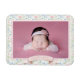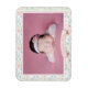 Este doce ímã fotográfico para bebês apresenta um padrão floral rosa e azul doce com um lugar para inserir a foto do seu bebê.
