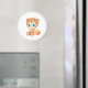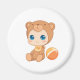 Bebê de desenho bonito vestido com um macacão de urso marrom com uma bib amarela decorada com uma minúscula abelha. A bola brilhante está descansando ao lado.