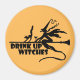 Design com o ditado "Beba Bruxas" com uma bruxa sobre uma vassoura com um gato e um martini.