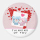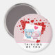 Magnet que diz: Pensando em você. Projetado com uma bela imagem de desenho animado de um par de ursos, um urso é rosa pastel com um pequeno arco e está beijando a bochecha de um urso azul que parece encantado. Muito fofo e kawaii. Muitos corações vermelhos flutuando por toda a parte. Fundo cor-de-rosa com um padrão de bolinhas branca
