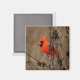 Pássaro vermelho incrível nos ramos de um morto ou árvore de queda com folhas marrons. O fundo faz o vermelho vivo das penas das aves se destacar e pop.