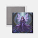 Uma bela fada vestindo um vestido roxo que flui e um colar feito de ametistas com violetas em seus longos cabelos roxos e asas tipo libélula roxa, segurando uma brecha violeta em uma floresta mágica cercada de cogumelos, flores e mossas coloridas, árvores cobertas de videira.