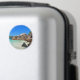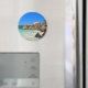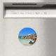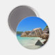 Um imã com uma fotografia de uma praia azul-turquesa oceânica com grandes rochas espalhadas ao longo da costa. Local tropical brilhante e ensolarado.