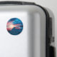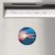 Magneta com uma bela fotografia. Um lugar cênico. Um lago tranquilo com uma doca de madeira que se estende para fora. Definir o sol fornece lindas cores no céu, vermelho e azul vibrantes.