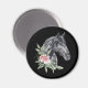 Imã preta em preto com uma bela ilustração de uma cabeça de cavalo preta com um rico de embelezamento floral perto do pescoço. Pintura de animais elegante e elegante.